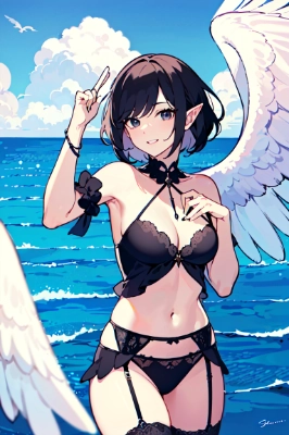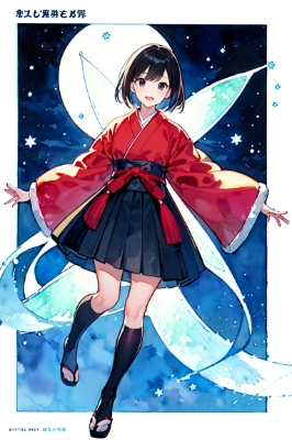 masterpiece, best quality, extremely detailed, anime, garter belt, straw hat, wet hair, black hair, black eyes, cheerleader, colorful, Japanese style, watercolor, wing, ruins, eating, winking, laughing <lora:flat2:0.2> <lora:hairdetailer:0.1> ,