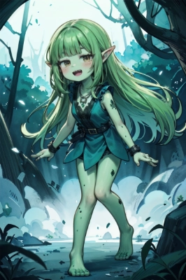 (dot nose:1.2),(deep green skin:1.5),hime cut, (goblin girl:1.1), (light green hair:1.2), (blunt bangs:1.2), (brown eyes:1.3), long hair, goblin,anthro,