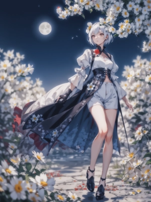 (blurry background:1.3), (extremely detailed fine touch:1.3), /// , girl, white short hair, (flower:1.3), red, blue, (moon:1.3), horizon, full body, autumn leaves, maple, autumn leaves, sneakers, white gothic lolita