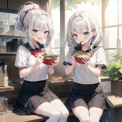 masterpiece, best quality, extremely detailed, anime, , pizza, a pretty woman, longhair, shorthair, skirt, zettai ryouiki, silver hair, blue eyes, sisters, two people, cafe, eating, grabbing, drinking,Hide one eye with one\'s hair, pizza, a pretty woman, longhair, shorthair, skirt, zettai ryouiki, silver hair, blue eyes, sisters, two people, cafe, eating, grabbing, drinking,