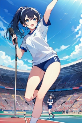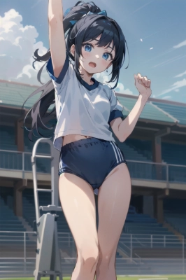 masterpiece, best quality, an anime girl, ((drak blue buruma)), ((gym uniform)), black hair, ponytail, buruma, slender body, white headband, (Wedgie buruma), gym uniform, (one arm up), ((raise one arm straight up)), (stand with both feet together), (stand up straight), brace, (open mouth), dignified face, look upward, (((stand on the podium))), blue sky, sports festival, bay, outdoors, school ground, (insanely detailed), ((many girl in buruma background)), many audience, Player oath, (sharp focus),