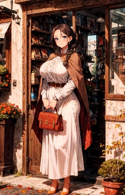 Masterpiece, best quality, highres, ultra detailed character ,illustration, beautiful woman, solo focus, forehead, parted bangs, blue eyes, half-closed eyes, curvy,huge breasts, red (tight:1.2) knit, (impossible clothes:1.2), long sleeves, denim pants, loafers, earrings, accessories, light smile, looking looking at viewer, standing, hands in pocket, clear sky, Row of trees, fallen leaf, sparrow, autumn, dutch angle
