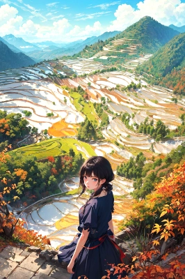 (masterpiece, highest quality, extreme detailed, best quality, official art, beautiful and aesthetic:1.2), (1girl), Wolf girl, blond hair, fantasy dirndl, autumn, dusk, sunset, backlight, golden wheat field, forest dyed with autumn leaves, detailed background