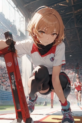 1female, a college student, in Olympiastadion Berlin, (Detailed chestnut short hair,yellow hair band, 2top tails ahoge:1.3), (perfect anatomy,perfect legs:1.3),(perfect hands,bare hands:1.3), (flat breasts), ((muscular thighs)), (a black tight bodysuit,and white track shirt, black tight turtle neck around, 1 red line neck opening, deep purple knee socks,black and red combination running shoes :1.2), complex, delicate, (Olympiastadion Berlin, 100meter main track starting grid:1.3), bright atmosphere , (simple shirt, left chest black,red,and blue mixed micro emblem), (1 red line around the neck), (beautiful clavicle), beautiful body line, lens flare, from below, low angle, focus eyes, (sunlight), (scenery), halo, (detailed brown eyes:1.3), (half closed eye, look far away), (heart-shaped face, cute face), 19yo, (serious), side view of girl, (leaning forward, with both spread hands on the ground, push up waist,left knee is standing, right legs stretch-back and put on starting block:1.5), waiting run start sign, from forward, static, majestic, Realistic, (subjective perspective),(light-shadow symmetry), (particle light,natural light,light rays,reflection,shadows,ray tracing:1.1),(The moment of kicking off from a crouching start: 1.3).