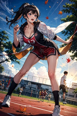 Create an illustration depicting an autumn sports day event. Show a school sports field filled with students in various colorful sports uniforms participating in traditional Japanese sports day activities, like relay races, tug-of-war, or sack races. Capture the essence of the fall season with leaves gently falling in the background and perhaps some students wearing light jackets or sweaters. Convey the spirit of teamwork, competition, and the joy of the season in their expressions and actions. Ensure that the illustration is vibrant and lively, with a sense of celebration in the air.