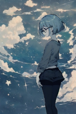 ((masterpiece, best quality, absurdres)), (pale colors:1.3), Clarity, (black tights:1.2), slim body, (short bob:1.4), blue hair, (no inner color:1.4), (no underlayer:1.2), flat chest, dark yellow eyes, shorts, (short pants over tights:1.4), smile, eat ramen, ramen shop, (many garlic:1.4), ,