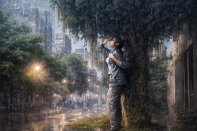 1girl, ultra detailed, phtorealistic, beautyful eyes, beautiful woman, beautiful face, office Street background, bush, <lora:more_details:0.9>, magic effect, middle hair, depth of field, (lens flare:0.1), straight hair, ponytail, office suit, raincoat, depth of field, fitting pose, (wind effect:0.1), <lora:PerfectFullBreasts-fCV3.5:0.9>breasts, (fog:0.8), unexplored region, brown eyes, (rain:1.3), fantastic, (shelter from the rain:1.3), standing under the eaves, look up at the sky, (lean against the wall:1.2), full body, dynamic pose,