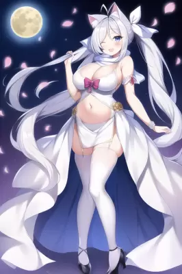 masterpiece, best quality, beautiful detailed girl, Scarf,whole body, overexposure, ;D, beautiful detailed fullbody, large breasts,, girl,woman,female, little,child,10 years old, absurdly long hair, half updo, parted bangs, hair over one eye, low twintails, wavy silver hair, two-tone hair, beautiful detailed hair, antenna hair, snowflakesdetailed cute anime face, smile, lovely big eyes, cat_ears, teeth, large_breasts, navel, zettai_ryouiki, bow, choker, bat_wings, stuffed_animal, fusion of beautiful long dress and miko, white_thighhighs, high_heels, Exquisite cloth, pale blue Clothes, moon, Flying petals, night, beautiful deatailed shadow,