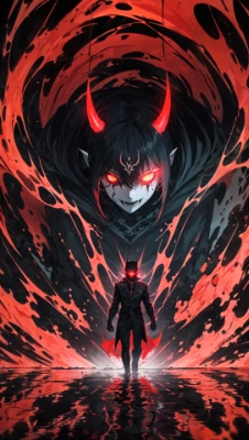 best quality, hyper detailed, pitch black world, black Rain, reflection on the water surface, (stylish devilish dark hero:1.3), (red glowing eyes), eerie silence, apocalypse, black background, [(black Wallpaper:1.4)::0.2]