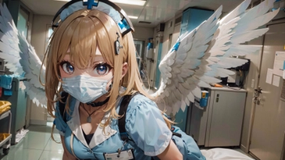 masterpiece,(best quality),highly detailed,(hospital room setting),clean,sterile,beeping machines,IV stand,(1figure,solo,stunning angel),(pure white angel),dressed as (nurse),radiant glow,feathery pristine white wings subtly visible,wearing white nurse uniform,offering comfort,essence of healing and care,from below,