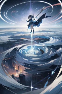 (exceptional, best aesthetic, new, newest, best quality, masterpiece, extremely detailed, anime:1.2), (Minimalism, chibi, solo:1.3), (dynamic pose:1.3), dynamic angle, Fantasy world, (game event cg:1.2), girl, A young witch in battle, wielding a staff and casting a powerful spell. The air swirls around her enemy, creating a (whirling) vortex. She has a determined expression and a flowing cloak. action, magic effect,,