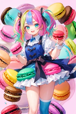 Masterpiece, high quality, high definition, super detailed, ((((( male age 20, ))))), (((hair color pastel))), short short hair to neck, bangs to eyes, yellowish green eyes, 8 head, slender nose, facial muscles, throat, clothes waiter, pants, mouth open, (lots of macaroons)) <lora:hairdetailer:0.8> <lora:asb-CH2:1> ,