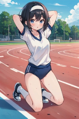 masterpiece, best quality, an anime girl, ((drak blue buruma)), ((gym uniform)), black hair, short hair, buruma, slender body, white headband, (Wedgie buruma), gym uniform, ((arms behind head)), (stand and spread legs), dignified face, sweat, blue sky, sports festival, bay, outdoors, track and field track, school ground, (insanely detailed), Documentary, ((a running girl in buruma and gym uniform behind)), (many audience), (sharp focus), (full body shot), medium breasts,