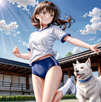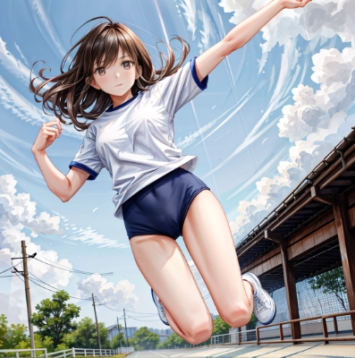(cinematic light), hyper detail, dramatic light,high resolution,8k,best quality, masterpiece, 1 female, white skin,brown eyes,detailed face,beautiful female,(realistic:1.0),(black hair:1.2), medium hair,BREAK,flat chest,23 years old,japanes female,(large breasts:1.1),BREAK, <lora:buruma:0.3>,(buruma:1.3),(gym uniform:1.1),(running and jumping:1.20),course track,(sky:1.0),<lora:add_detail:1>