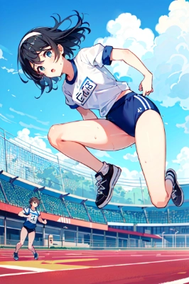 masterpiece, best quality, an anime girl, ((drak blue buruma)), ((gym uniform)), black hair, short hair, buruma, slender body, white headband, (Wedgie buruma), gym uniform, (clench your sides and bend down), open mouth, dignified face, blue sky, sports festival, bay, outdoors, track and field track, school ground, (insanely detailed), Documentary, ((many girl in buruma cheering background)), ((a running girl in buruma and gym uniform behind), many audience, Full body shot, (sharp focus),