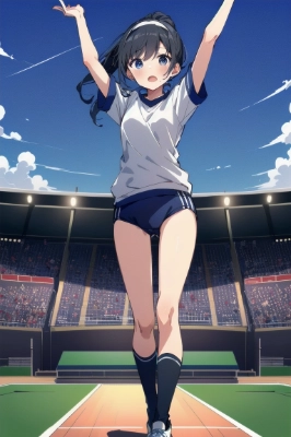 masterpiece, best quality, an anime girl, ((drak blue buruma)), ((gym uniform)), black hair, short hair, buruma, slender body, white headband, (Wedgie buruma), gym uniform, (((long jump))), (Fosbury Flop), dignified face, ((jump)), sweat, ((midair)), blue sky, sports festival, bay, outdoors, track and field track, athletics stadium, sandbox, (insanely detailed), Documentary, ((a running girl in buruma and gym uniform behind)), (many audience), (sharp focus), low angle shot, medium breasts,