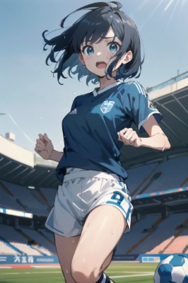 masterpiece, best quality, an anime girl, ((blue and white soccer uniform)), black hair, short hair, buruma, slender body, blue soccer uniform, (play soccer), running, dignified face, sweat, blue sky, sports festival, bay, outdoors, (soccer stadium), (insanely detailed), Documentary, (many audience), Full body shot, medium breasts,