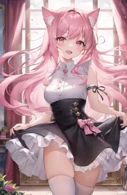 ((((masterpiece, best quality, ultra-detailed)))), (official_art), laugh, (((pink long fluffy hair, floating hair, fake cat ears, ((tsurime))))), skin_fang, open mouth, black dress, flared skirt, white blouse, Thigh-high socks, skindentation, girly chaos, clothes reflecting light, fancy room, dappled_sunlight, particle, shiny skin