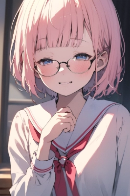 1high-school girl,solo,little girl,like child,pale skin,slender,thin eyes,pink hair,(short bob hair),glasses,half-closed eyes,blunt bangs,evil grin,perfect breasts,BREAK,
