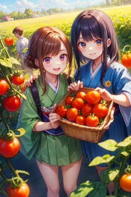 Masterpiece, high quality, high image quality, super detailed, very delicate and beautiful, girl, high school student, red hair two side up to waist, eyes sharp and strong glossy glossy eyes, eyebrows glossy, eye color magenta, 6.5 head tall, knee socks, smiling, (lots of tomatoes) , standing ,