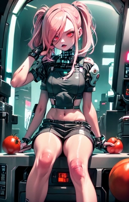 <lora:sanDka1:1> <lora:sanDka2:1> , tomato, a pretty woman, longhair, pink hair, red eyes, mecha girl, foreshortening, robot, mecha, cyberpunk, demon, succubus, fantasy, monster, magic, night, eating, waiting, smiling, winking, cool ,tomato girl, vanpire , blady tomato,