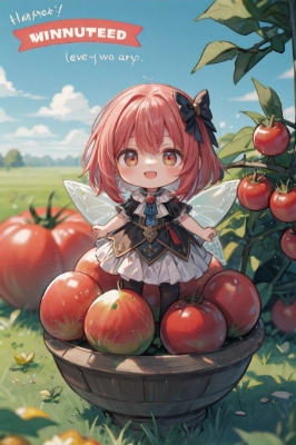 masterpiece, best quality, extremely detailed, fairy tale, (chibi:1), long hair, gray hair,purple eyes,tomatoes,((tomato on the lips)),((kiss the tomato)),((happy smile)), long skirt, witch, witch hat, witch robe, witch rod ,sunshine,blue sky,((many flowers behind))<lora:hairdetailer:1> ,,