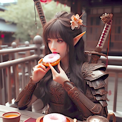 リンディスは人間界での新たな冒険の中で、美味しいものに出会うことが多かった。ある日、町の中心部を歩いていると、甘い香りが漂ってきた。その香りの源は、小さなドーナツ屋台だった。 リンディス:\"あれは一体何の香りかしら?\"