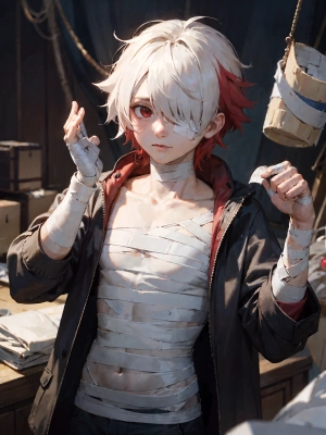 male focus, 1boy, solo, male child, petite, toddler, shota, white hair, red eyes, clenched teeth, crossed legs, shorts, short sleeves, head rest, fang, vampire, cape,