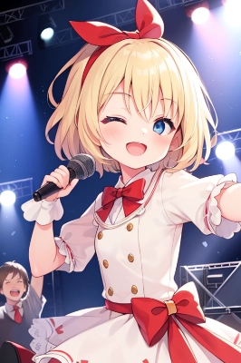 masterpiece, best quality, detailed face,, 1girl,loli, blond hair,short hair,hair bow,red bow,blue eyes,(crowd:1.2),singing, (stage,Spotlight:1.2), (happy smile:1),(one eye closed:1),(point at viewer:1)