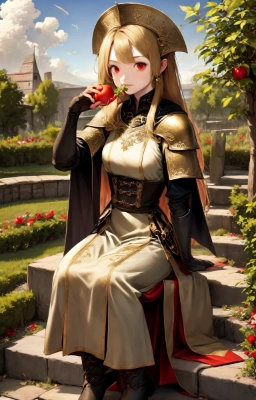 One female Lady Lord, dignified and handsome face, long silver hair, crimson eyes, mid-chest, 23 year old lady:1.1, a seductive wink:1.5, a seductive smile, noble expression, noble fabric, aristocratic wife\@!@s dress, white gloves up to the elbow, wedding ring on left hand ring finger, full body, medieval garden, dynamic angle, blue sky, wide shot,