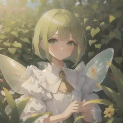 (masterpiece, best quality, ultra detailed)++, oil painting, concept art, a cute fairy girl, bust shot, (white short hair)+, bob cut, pale purple eyes, kawaii face, simple white one piece, (pair of transparent wings)+, lilac flowers, vivid, dark background