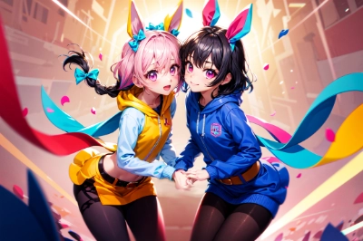 (2femboys, couple focus:1.7), masterpiece, best quality, extremely detailed, (brushwork of action painting:1.5), (airbrush painting, blurred, bounce lighting:1.4), (2 pure and lustful femboys, pink eyes, flat chest, slender:1.3), (purple cropped Zip Up Sweatshirt, open jacket, hood down, white purple horizontal stripe shirt, midriff peek, black mini skirt, black pantyhose, little black hair bows:1.2), (green suede belt:0.9), (gravure model pose:1.2), seductive smile, (looking at view, panty shot:0.2), energetic compositions, (colorful abstract rays:1.2), (abstract petals:1.2), (motion blur, chromatic_aberration:1.4), (pink and multi-colored hair braid:1.0), (fisheye lens:0.4), (character focus, full figure:0.1), (dynamic angle, in comiket:1.1), <lora:flat2:-0.7> <lora:boldline:-1> ,