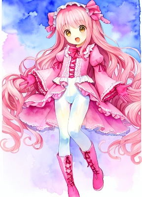 pastel pink\" \"pastel blue\" \"Pink sky with cloud\" \"light color\" \"fantasy\" {\"watercolor painting\"} {\"Analog Illustration\"} girl smile {{{{\"dream cute\"}}}} {{chibi}} {sweets} {{{\"sickly cute\"}}} sleeping