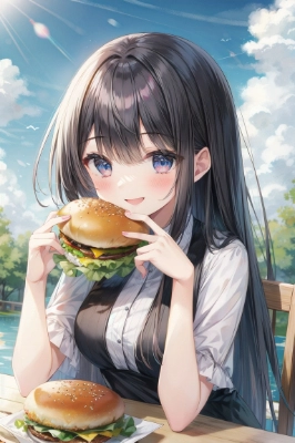 1girl, black hair, red eyes,pretty detailed beautiful eyes, low twintails, ahoge, dress, jacket_over_blouse star graphics detailed, cute, kawaii, bow_hair_clips, smiling, holding a cat plush in arms, cute background, fantasy, bedroom, smiling,