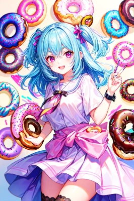 Masterpiece, high quality, super clear, super detailed, ((((( male handsome, adult mature age 30 years old, ))))), purple eyes, cool with suspended eyes, V shaped eyebrows, body strong and fearless 8.5 head tall, cold well-groomed black short hair to neck, (((bangs parted in threes))), slender nose, expression lines, throat, clothes Black vest, black tie, white shirt, butler, scowling smile, (((lots and lots of doughnuts))),