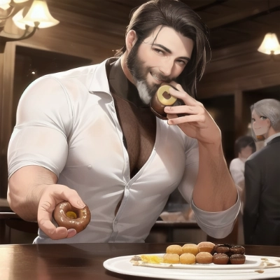 1boy,(highly detail face: 1.2),gentle man,(Eat the doughnut, in hand),