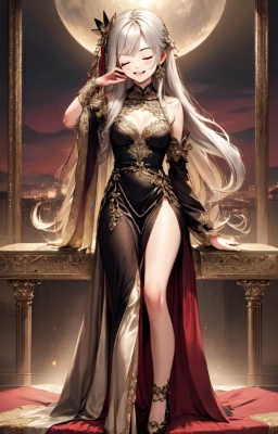 Whole body, solo focus, mysterious and gorgeous metal style, lady, short hair, asymmetrical bangs, beautiful dense glass hair, pale silver hair, delicate and beautiful face, Red eyes, sly smile, dress, waist-high slit on one side of skirt, no underwear, see-through: 1.1, 20-year-old female: 1.1, holding a pot of mapo tofu in her hand. (dusk), (dazzle: 1.2), sunset, glow, compound light, lens flare, high resolution, <lora:hairdetailer:0> <lora:sensualface_type2:1> ,