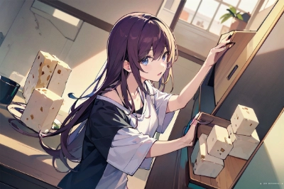masterpiece, best quality, extremely detailed, anime <lora:make25d_type2_v100:1> <lora:sensualface_type2:1> , donut, a pretty woman, twintail, long sleeve, skirt, red hair, blue eyes, maid, foreshortening, cooking, evening sun, crying, eating, healing, blushing,