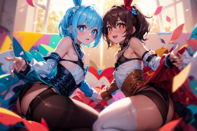 masterpiece, best quality, extremely detailed, (brushwork of action painting:1.5), (airbrush painting, blurred, bounce lighting:1.4), (a pure and lustful femboy, heart-shaped pupils, flat chest, slender, hair over one eye, bob cut, giggling:1.3), (black slingshot micro bikini:1.3), (violet dog ears, violet fur collar, violet fur bangles, violet fur trim lavender thighhighs, lavender long gloves:1.2), (dick in bikini:1.3), (i-shaped balance, standing split:1.4), (looking at view:0.2), energetic compositions, (abstract rays:1.2), (abstract petals:1.2), (motion blur, chromatic_aberration:1.4), (lavender pink and multi-colored hair:1.0), (fisheye lens, full figure:0.4), (character focus, dutch angle:0.9), (in comiket:1.1), <lora:flat1:-0.65> <lora:boldline:-1> ,