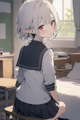 masterpiece, best quality, extremely detailed, anime , girl, shorthair, ahoge, white hair, red eyes, elf, student, fantasyLike high school students,a feeling of lack of confidence、poor milk、have short bangs、scratch the back of one\@!@s ear、gentle-looking eyes、kneeling on the bed、Inside the hotel room in the fantasy world、pale red eyes、,