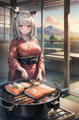girl,RAW photo, best quality,realistic, photo-realistic, best quality ,masterpiece,an extremely delicate and beautiful, extremely detailed,2k wallpaper, Amazing, finely detail, 8k wallpaper,huge filesize , ultra-detailed, highres, extremely detailed,realistic, 8K, Ultra-High Definition, highest quality, ultra high resolution, (realistic:1.3), High quality texture, (2girls:1.1), kimono, cat ears, cat tail, medium breast, blond hair, pattern, (tan:1.2), wet hair, wet clothes, wet skin, (Kotatsu:1.4), ,sunset, <lora:flat2:-0.7> <lora:sanDka2:0.2>Japanese-style room, porch,japanese garden view:1.1),(tatami:1),