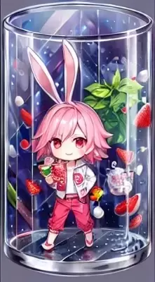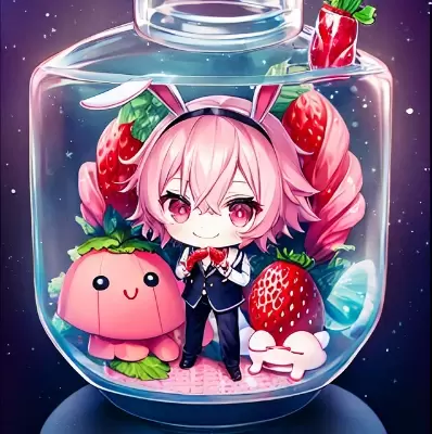 (((1boy))) darkgreenhair medium-ponytail round-glasses kimono chocolate rose cat-ear strawberry chibi SD NENDOROID smile solo (( in a glass-jar)) strawberry-soda straw