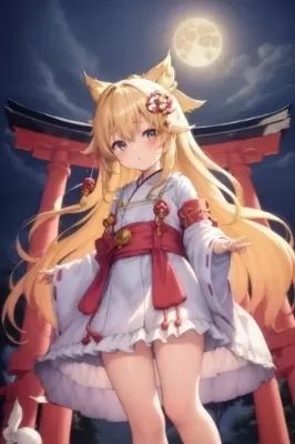 ((masterpiece)), ((illustration)), ((best quality)), ((highres)), ((wallpaper)), moon, night, 1girl, loli, ((little female child)), emerald green eyes, hatsune miku, shinto shrine , torii, cute, kawaii