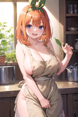 masterpiece, best quality, highres, aamiyako, long hair, jewelry, earrings,huge brest, (naked apron:1.2), smile, looking at viewer, indoors, ass, <lora:itsukinakanotest:1> itsuki nakano, bangs, blue eyes, hair between eyes, ahoge, red hair, star (symbol), hair ornament, star hair ornament