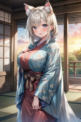 girl,RAW photo, best quality,realistic, photo-realistic, best quality ,masterpiece,an extremely delicate and beautiful, extremely detailed,2k wallpaper, Amazing, finely detail, 8k wallpaper,huge filesize , ultra-detailed, highres, extremely detailed,realistic, 8K, Ultra-High Definition, highest quality, ultra high resolution, (realistic:1.3), High quality texture, (2girls:1.1), kimono, cat ears, cat tail, medium breast, blond hair, pattern, (tan:1.2), wet hair, wet clothes, wet skin, (Matsutake mushrooms, harvest:1.4), ,sunset, <lora:flat2:-0.7> <lora:sanDka2:0.2>Japanese-style room, porch,japanese garden view:1.1),(tatami:1),,,
