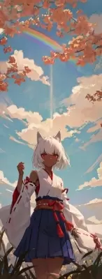 magnificent view, (worm's-eye view:1.2), pile up, (masterpiece:1.2), (best quality:1.2), (novel illustration:1.1), (solo:1.2), brave female, (muscular female:0.5), (dark-skinned:1.3) female, (simple Japanese miko clothes:1.2), dress, frills, fox ears, (white hair), sharp red eyes, small chest, detailed face, extremely detailed, shiny tiny paddle on the ground, wet ground,