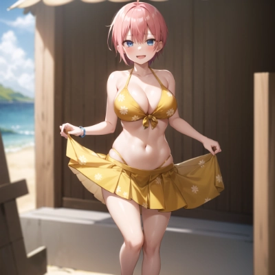 2d, masterpiece, best quality, anime, highly detailed, (1girl, solo:1.5), (nakano nino), pink hair, short hair, butterfly hair ornament, breasts, (cleavage:1.2), medium breasts, (18 years old), <lora:quintuplets-10-new:1>, bangs, blue eyes, jewelry, navel, barefoot, hand on hip, blunt bangs, looking at viewer, blush, nail polish, necklace, full body, midriff, anklet, skirt, smile, toenail polish, off shoulder, bracelet, swimsuit, collarbone, purple bikini, frills, toenails, bare shoulders, long skirt, collarbone, purple bikini, frills purple skirt, skirt hold,see-through, sarong, beach, island,
