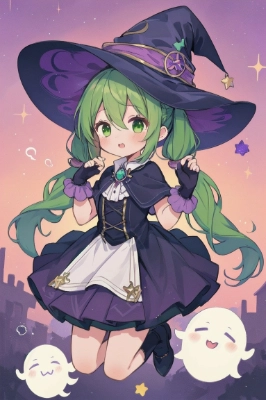 From behind last supper stylelast supper style Halloween night Masked pumpkin, Slime Wynn the Wind Charmer(Yu-Gi-Oh! OCG)l, zipper costume, ride thrown Passenger Halloween pumpkins come and go in the sky, falling apart throw pumpkin,green hair long wavy hair twintails.hairs between eyes,green eyes,