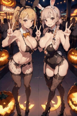 1girls, pompous pose, (perfect hands, double piece sign, stand 2 fingers:1.33), (perfect breasts), (great smile, half-opened mouth, joy:1.4), (detailed large brown eyes), (moist eyes:1.3), (bunny ears headband), pale skin, cute college school girl, heart-shaped faces, (bunny suit, black leather jacket, no look cleavage), (perfect legs, Fishnet tights:1.3), (region:Monaco, casino lounge), Her name is Amada Kokoro, 2nd year high school student attending AMD Academy, Born on February 4th, 16yo, Her hair is semi-long black with ahoge, (and her eyes are green:1.3), Her image colors is AMD's corporate colors : green, black, and white, (perfect hands, and only 5fingers:1.3), (peace fingers, v-sign:1.33), (realistic), (best quality), (ultra-detailed), (extremely detailed CG 8k), (very fine 8K CG), amazing, crystal-clear-glass: full of candy pop sweets, (inner pumpkin:1.3), nature, real, strange, (jet-black hair, colored green inner hair, split-color hair:1.3).