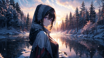 The Yuki-onna stands gracefully. Snow particles dance around her in harmony,complementing the snowy vista. Her presence seems to merge with the natural surroundings,embodying the mysticism and beauty of the mountains,This illustration captures the enchanting beauty of the Yuki-onna in perfect harmony with nature. It evokes feelings of peace,awe,and the intricate relationship between beauty and mystique found in the snowy landscape,BREAK